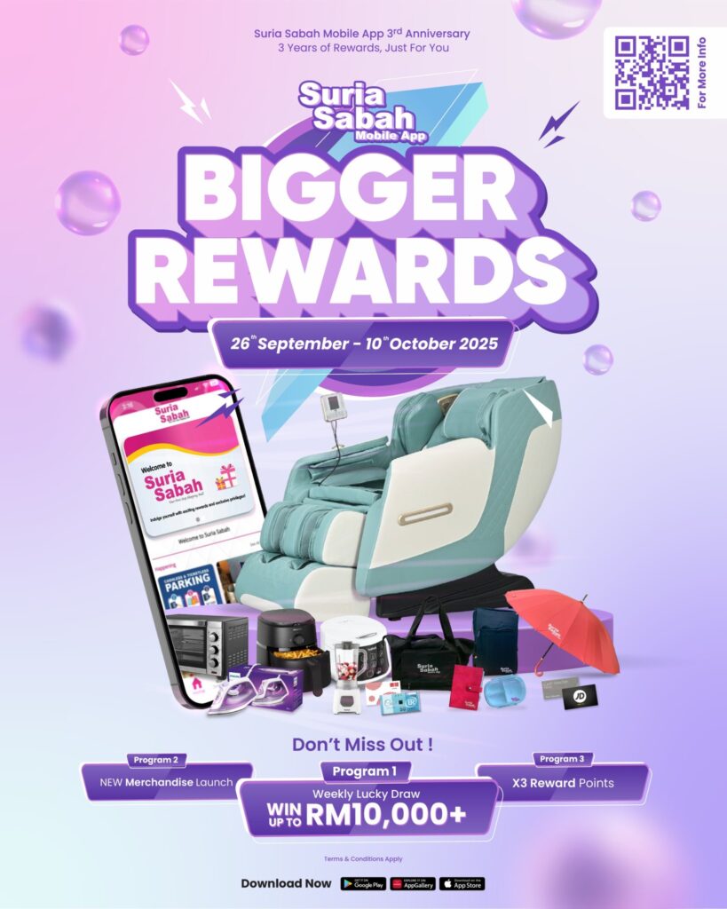 🎊 We’re celebrating Suria Sabah’s Mobile App 3rd Anniversary soon! 🎊 This means BIGGER REWARDS is coming for EVERYONE! 😱🤩 ✨ Don’t miss out on: • Weekly Lucky Draws • New Merchandise Launches • 3X Reward Points 📅 26 September – 10 October 2025 Haven’t downloaded the app yet? What are you waiting for? 👉 Download now and enjoy the celebration! 🎁 #SuriaSabahMobileApp #SuriaSabahMobileAppAnniversary #3rdAnniversary #rewards #biggerrewards #suriasabah #suriasabahkk #suriasabahkotakinabalu #suriasabahshoppingmall