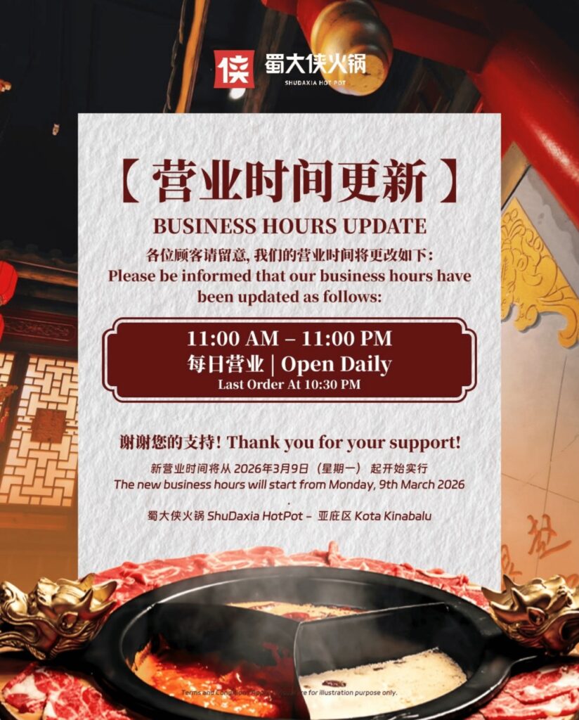 ๐ฅ Great news for hot pot fans! Your favourite hot pot spot Shu Da Xia Hot Pot has updated their business hours. โฐ 11:00 AM โ 11:00 PM (Open Daily) ๐ Last order at 10:30 PM Perfect for lunch, dinner, or a late-night hot pot feast! ๐ฒ Come enjoy the rich flavours and warm dining experience at Shu Da Xia Hot Pot today. ๐First Floor, Lot 1-3, 1-5, 1-6 & 1-7