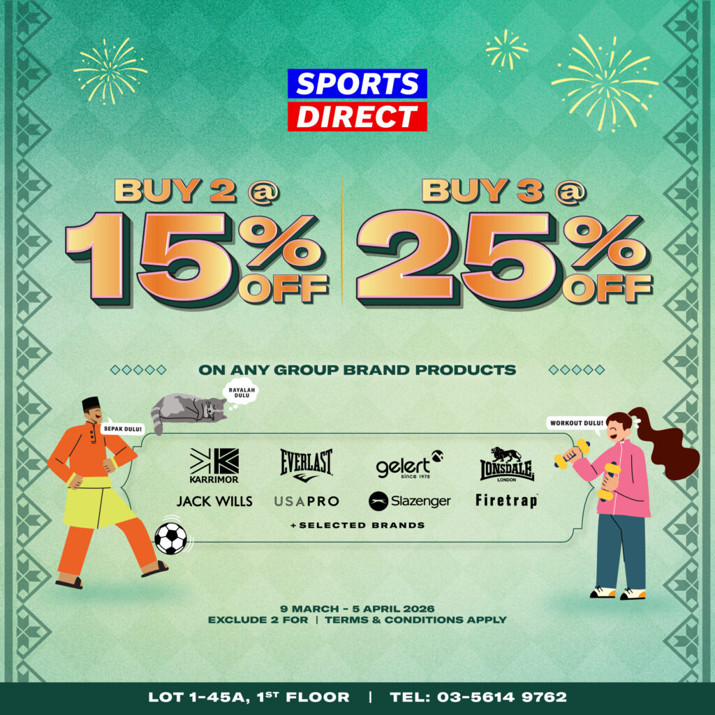 Celebrate Raya with great deals at Sports Direct! ๐โจ Enjoy special savings on our group brand products: Buy 2 @ 15% OFF Buy 3 @ 25% OFF Featuring brands such as Karrimor, Everlast, Gelert, Lonsdale, Jack Wills, USA Pro, Slazenger, Firetrap and more.