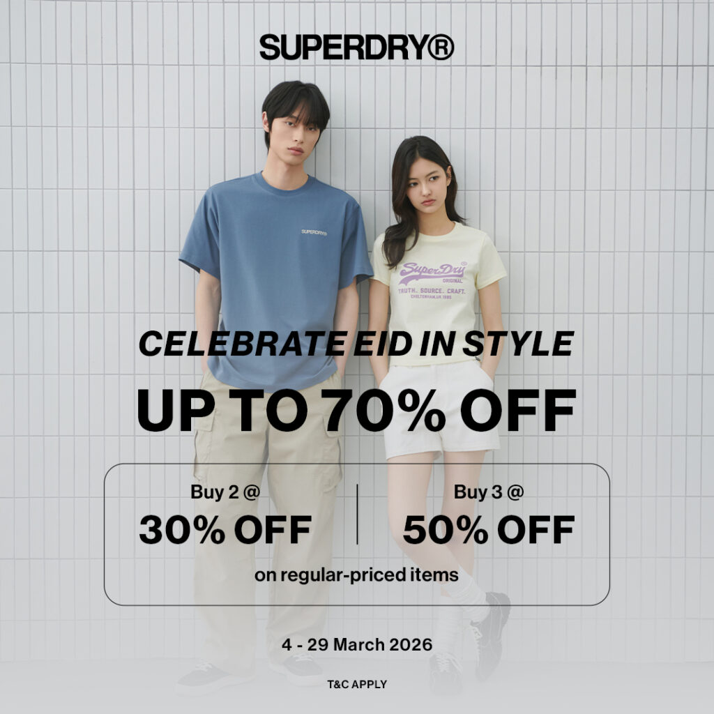 Eid-ready fits, elevated. Up to 70% OFF + extra when you buy 2 or 3. Celebrate in style, 4โ29 March. Visit SUPERDRY now at G-12 & G-77 #SuperdryMY #EidInStyle