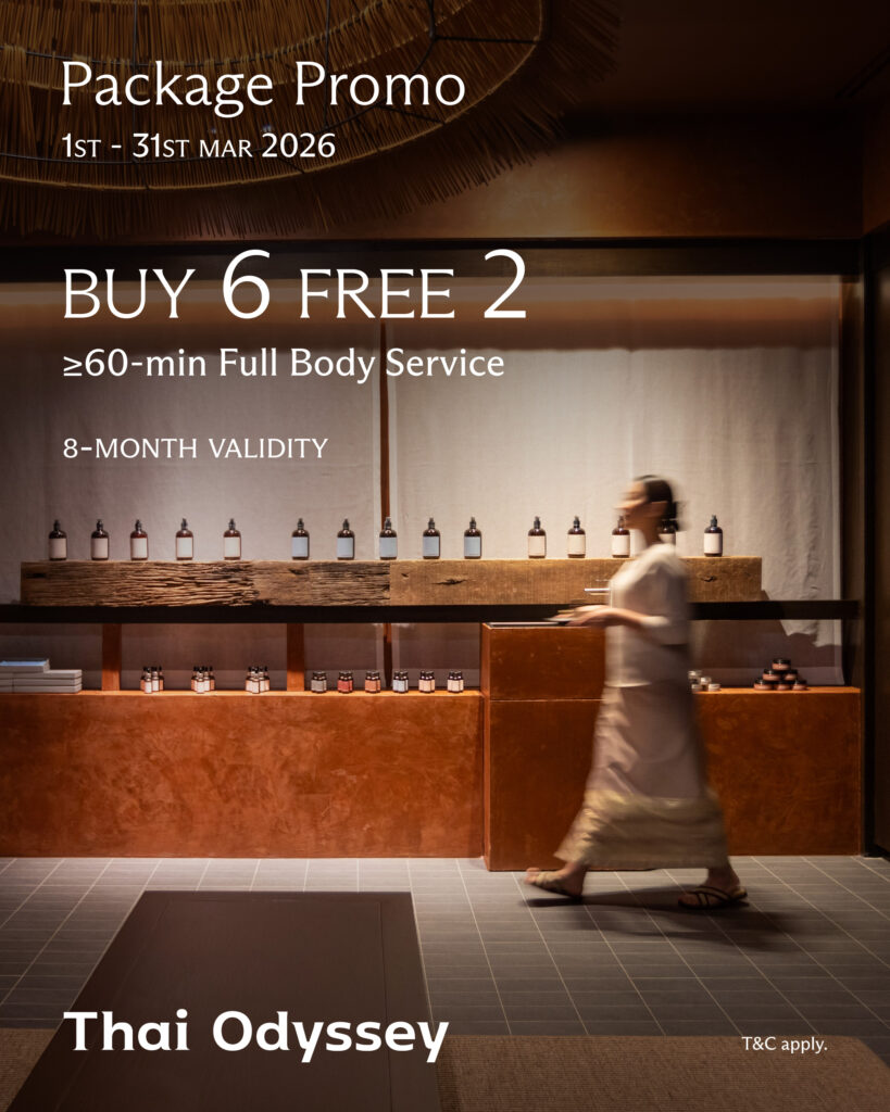 Need a regular massage fix? You can now buy 6 free 2 full-body services at Thai Odyssey and enjoy them throughout an 8-month validity. Visit Lot No. 2-34, 2-35 & Part of 2-28A today, promo till 31 March 2026. T&C apply.