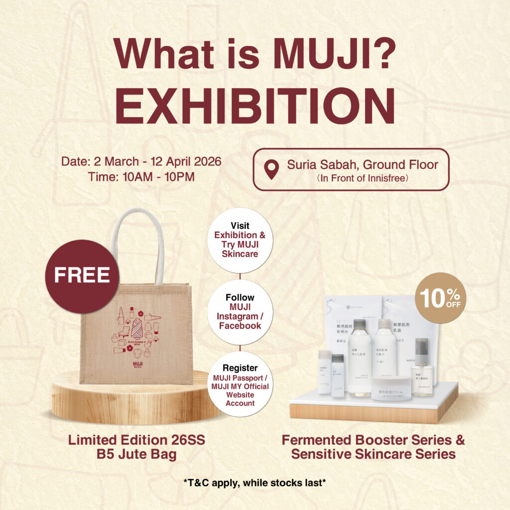 Kopivasian! Visit the What is MUJI Exhibition at Suria Sabah and explore the philosophy, design, and everyday essentials behind MUJI. Enjoy 10% OFF the Fermented Booster & Sensitive Skincare Series and receive a FREE Limited Edition MUJI 26SS B5 Jute Bag with 3 simple steps. ๐ Ground Floor, Suria Sabah (in front of Innisfree) ๐ 2 March - 12 April 2026 โโโโโโ โฐ 10AM โ 10PM
